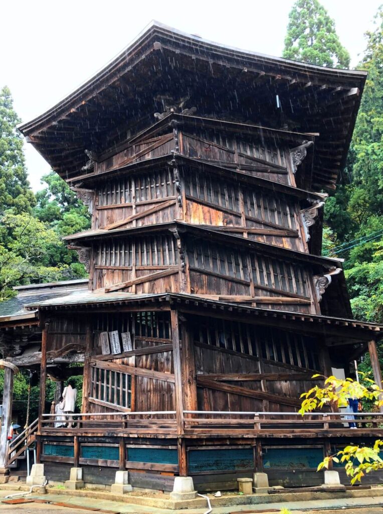 一人旅は、ホテルへの到着が遅れたり、2日目は台風の影響で雨に見舞われたりと、決して順調とは言えないスタートでした。とりあえず予定通り、強い雨の中で国指定重要文化財『さざえ堂』へ向かいました。さざえ堂の周辺には『白虎隊十九士の墓』や、小さなお土産屋が並ぶ飯盛山仲見世があります。